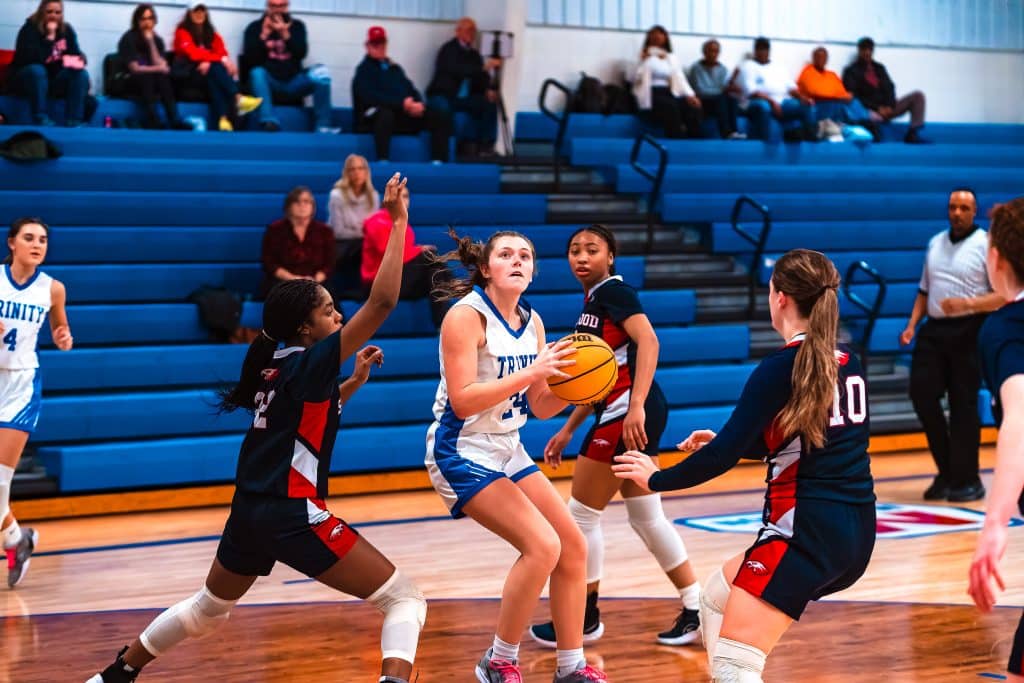 Brinley Vinson, with 23 points, Maddie George, with 19, and Maddie Grace Alligood, with 12, all reached double-figures, though Chloe Rozier and Addie Kendrick, following closely behind the leaders with eight and seven points respectively, likely did just as much or more to help Trinity keep up a breakneck pace of play that sent the game on a snowball’s path once it turned during a very active four-minute stretch early in the opening half.