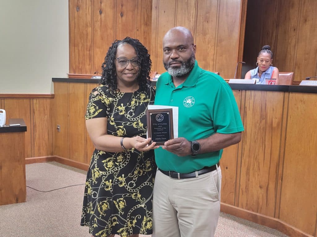 Joletha Dixon, administrative assistant for Dublin Fire Chief Matthew Cutler, receives the 2025 Employee of the Quarter from Councilman Bennie Jones/PAYTON TOWNS III