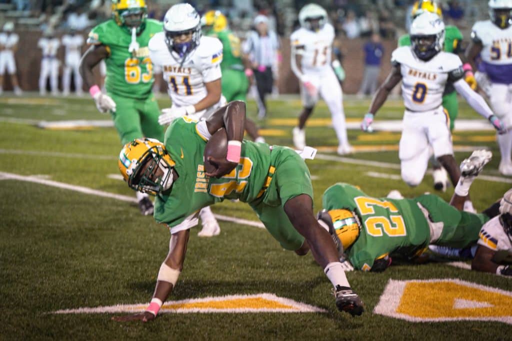 The Irish took their first lead on just a third possession of the game. The drive was highlighted by a big pass from Jeff Davis to Will Wallace, and finished on a 3-yard plunge into the end zone by Jaydon McRae. Urick Andrews’ point-after was good to give Dublin a 14-10 lead with less than two minutes to play in the half.