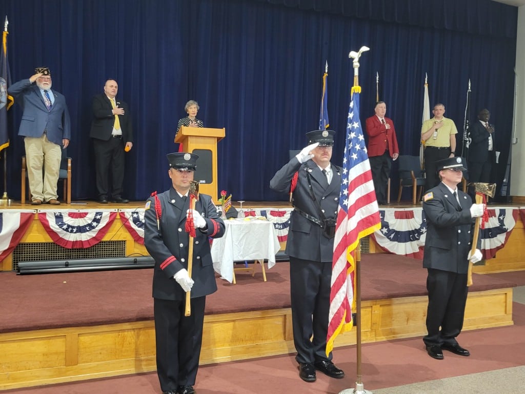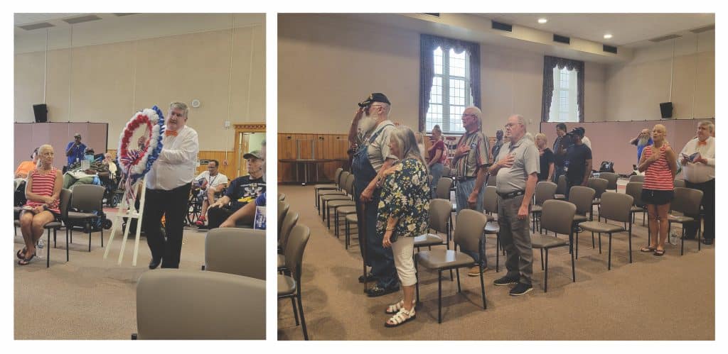 John Compton, U.S. Navy veteran, brought the Memorial Day wreath to the front of the room and saluted it before James Drury, with American Legion Post 17 Padgett Webb, led the Prisoner of War/Missing In Action remembrance followed by a moment of silence.